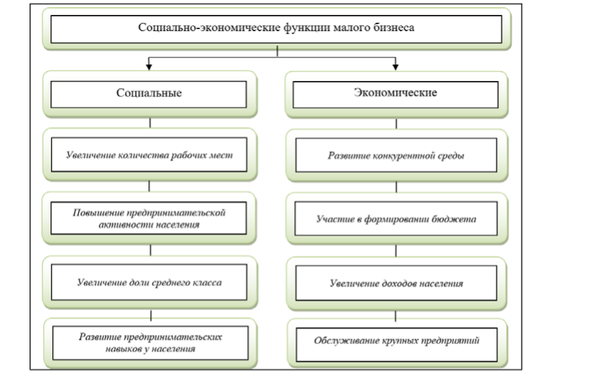 Субъект малого предпринимательство (далее- СМП) – это особый вид экономического субъекта, для которого характерны такие черты, как возможность творческой реализации, коммерческий настрой, однако такая деятельность связанна с риском . Отличительной особенностью малого предпринимательства является его доступность, как сферы деятельности для широкого круга людей, которая обусловлена тем, что функционирование малого предпринимательства не предполагает крупных финансовых вложений, не требует больших материальных и трудовых ресурсов. Бесспорно, развитие малых предприятий ведет к насыщению рынка товарами и услугами, повышению экспортного потенциала, лучшему использованию местных сырьевых ресурсов. Малые предприятия оказывают меньше воздействия и на экологическую обстановку. Все эти и многие другие свойства малого бизнеса делают его развитие существенным фактором и составной частью реформирования экономики России . Критерии отнесения хозяйствующих субъектов к малому предпринимательству определены Федеральным законом от 24 июля 2007 г. № 209-ФЗ «О развитии малого и среднего предпринимательства в Российской Федерации» (далее – ФЗ № 209-ФЗ): • доля участия других лиц в уставном капитале хозяйственных обществ, хозяйственных партнерств; • среднесписочная численность работников; • доход, полученный от предпринимательской деятельности. В зависимости от средней численности работников за календарный год СМП подразделяются на: -микропредприятия — до 15 работников; -малые предприятия — до 100 работников включительно; -средние предприятия — от 101 до 250 работников включительно. В зависимости от оборота: -микропредприятия — 120 млн рублей; -малые предприятия — 800 млн рублей; -средние предприятия — 2 млрд рублей . При этом согласно Федеральному закону № 209-ФЗ категория субъекта МСП – микро, малое и среднее предприятие, определяется в соответствии с наибольшим по значению условием отнесения хозяйствующих субъектов к субъектам МСП в части среднесписочной численности работников и дохода от предпринимательской деятельности . Наряду с этим в экономически развитых странах к малому бизнесу относятся большее количество предприятий, чем в России: в США и Японии порог ограничения по численности персонала малого бизнеса в несколько раз выше, чем в России. Этим, бесспорно, обусловлено большее влияние субьектов МСП на экономику зарубежных развитых стран (Приложение А) . Особенностями СМП являются: — Специализация и кооперация, которая приводит к повышению качества продукции; — Существенная атмосфера конкуренции, которая способствует развитию малых предприятий; -Высокий уровень предложения в потребительской сфере . ДРАМАРЕЦКАЯВ интересах экономического развития страны, малые предприятия выполняют важные социально-экономический функции (Рисунок 1). Рисунок 1- Социально-экономические функции малого бизнеса Таким образом, для экономического роста России, малое предпринимательство имеет большое значение, преимущества и недостатки которого рассмотрены ниже .