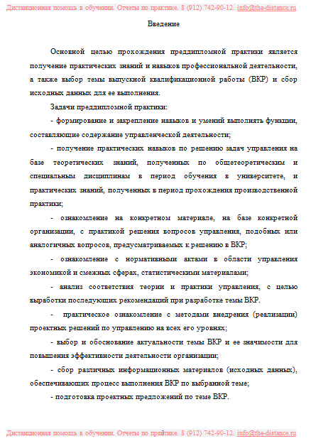 Задачи преддипломной практики: — формирование и закрепление навыков и умений выполнять функции, составляющие содержание управленческой деятельности; — получение практических навыков по решению задач управления на базе теоретических знаний, полученных по общетеоретическим и специальным дисциплинам в период обучения в университете, и практических знаний, полученных в период прохождения производственной практики;